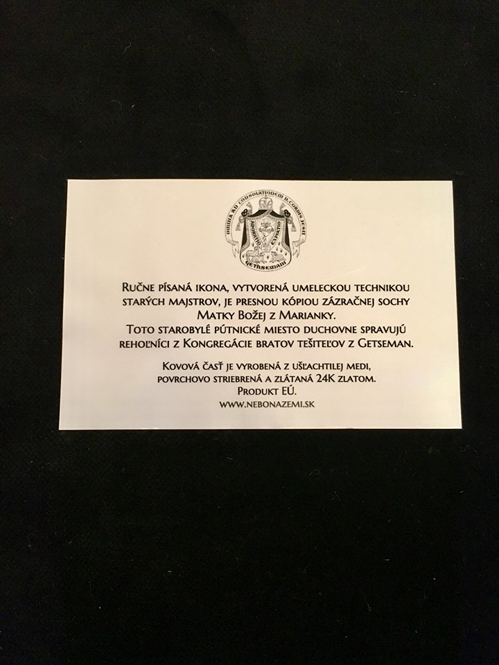 Vám Kongregácia bratov tešiteľov z Getseman v spolupráci s internetovým obchodom www.nebonazemi.sk prinášajú jedinečnú – ručne písanú, striebrenú a 24K zlatom zlátenú ikonu, ktorá je vernou kópiou Zázračnej sochy Panny Márie z hlavného oltára Baziliky v Marianke.