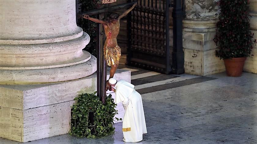 Objať jeho kríž znamená nájsť odvahu objať všetky protivenstvá terajšej doby, zanechať na chvíľu náš zhon po všemohúcnosti a vlastníctve, aby sme dali priestor tvorivosti, ktorú je schopný vzbudiť iba Duch Svätý. Znamená to nájsť odvahu otvárať priestory, kde sa všetci budú môcť cítiť ako povolaní a umožniť nové formy pohostinnosti, bratstva a solidarity. V jeho kríži sme boli spasení, aby sme prijali nádej a umožnili, aby ona posilňovala a udržiavala všetky možné spôsoby a cesty, ktoré nám môžu napomôcť chrániť sa a chrániť druhých. Objímme Pána, aby sme objali nádej: toto je sila viery, ktorá oslobodzuje od strachu a vlieva nádej.