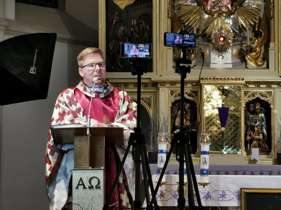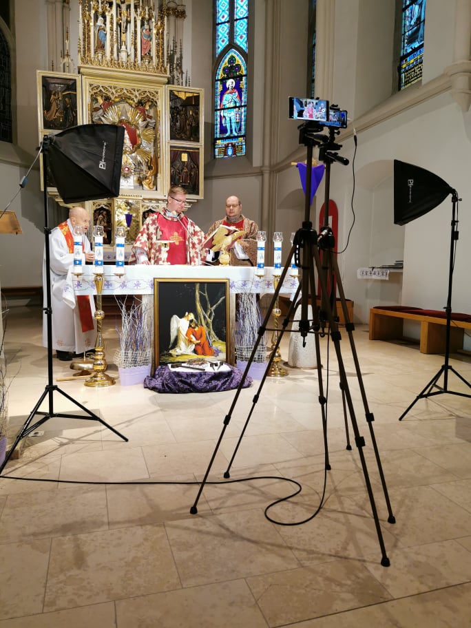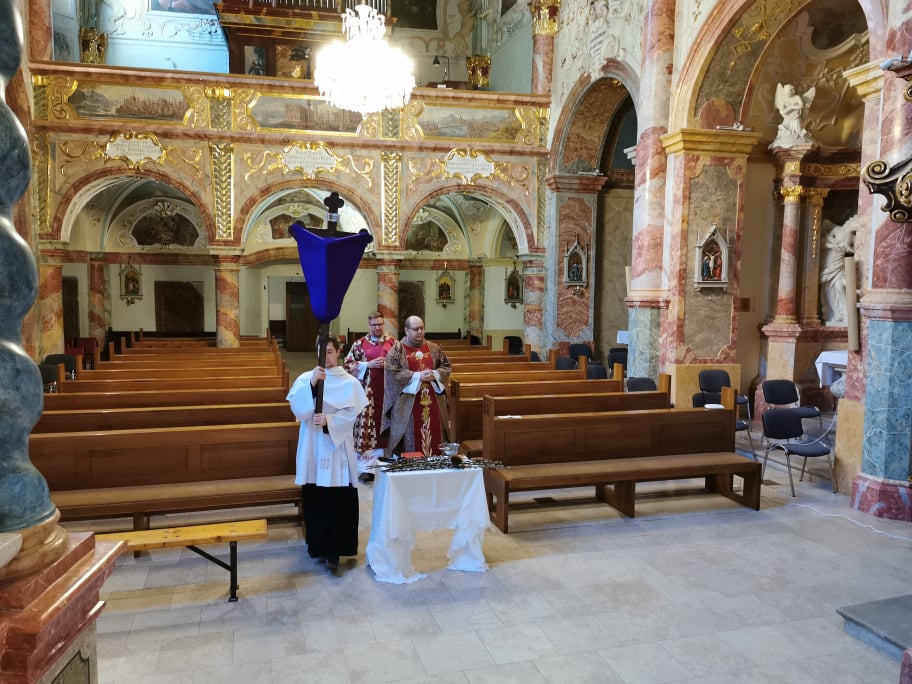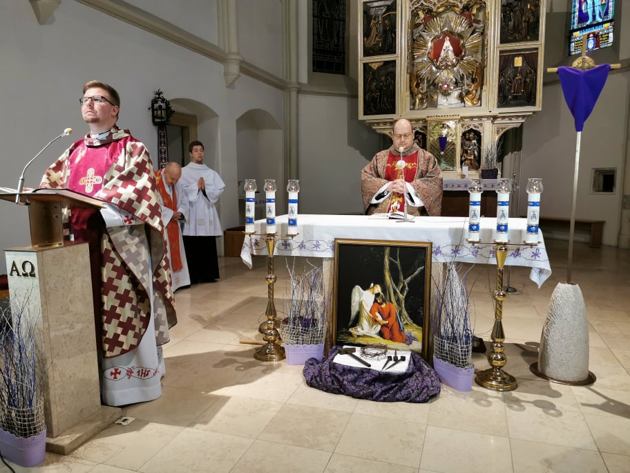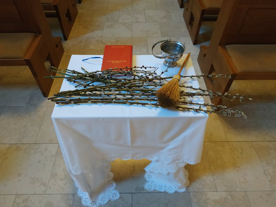 Naša komunita v Marianke slávila obrady Kvetnej nedele pri zatvorených dverách kostola nášho pútnického miesta , ale v spojení v modlitbe so Svätým Otcom a celou Cirkvou. Obradom, ktoré sa začali o 18.00 hod. predsedal  páter Faustyn Wesołowski. Požehnal palmové ratolesti a  bahniatka.